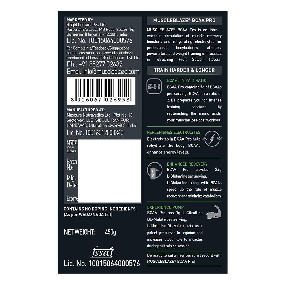 Packed with necessary BCAA: Each serving of MuscleBlaze BCAA pro contains 7 grams of branched chain amino acids. The BCAAs leucine, isoleucine and valine are found in the 2:1:1 ratio which is most beneficial to your muscles.
